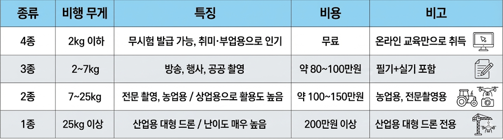 드론 자격증은 비행체 무게 기준에 따라 1~4종으로 구분됩니다.